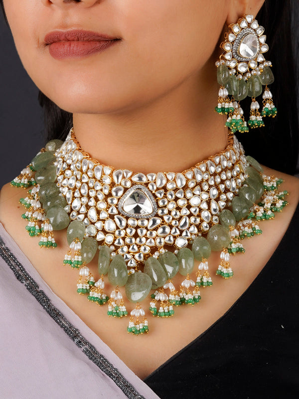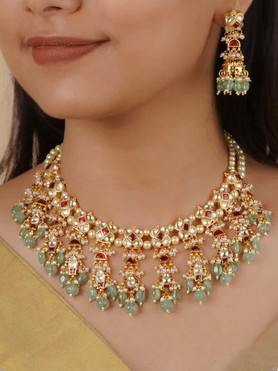 The Mishr Necklace Set, with its blend of traditional motifs and modern flair, speaks to the soul of the contemporary woman who carries her heritage with pride. Each piece, adorned with stones set in the Jadau style, radiates a warmth reminiscent of the sun-drenched lands of its origin.