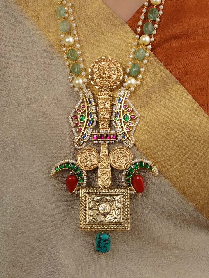 Mishr, by Mortantra is a collection of handcrafted Indian jewellery made with motifs of several kinds, having many different forms, features and emotions. Made with hand fully picked motifs, new and old, semi-precious beads and stones, our Mishra jewellery is an amalgamation of heritage and heirloom jewellery traditions and the rich craftsmanship of India. The jewellery is 22kt gold plated and finished in cultured pearls and takes pride in being skillfully crafted by the few of the finest jewellery artisans of our country.