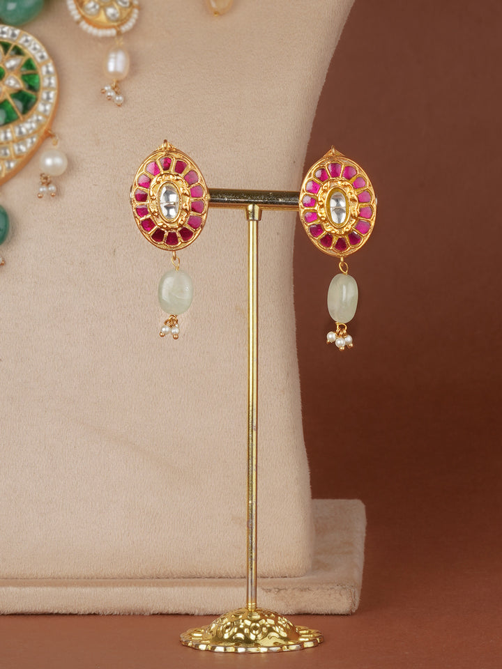 Our Thappa Jadau collection is made with a unique technique generally seen only in real Polki jewellery. We use Faux Polki stones cut in a special way that shine like uncut polkis and set then ‘laakh’ for setting the stones and giving them the look of the Thappa jewellery. Our Thappa Jadau collection is plated in 18kt gold and finished with semi-precious beads and hangings.