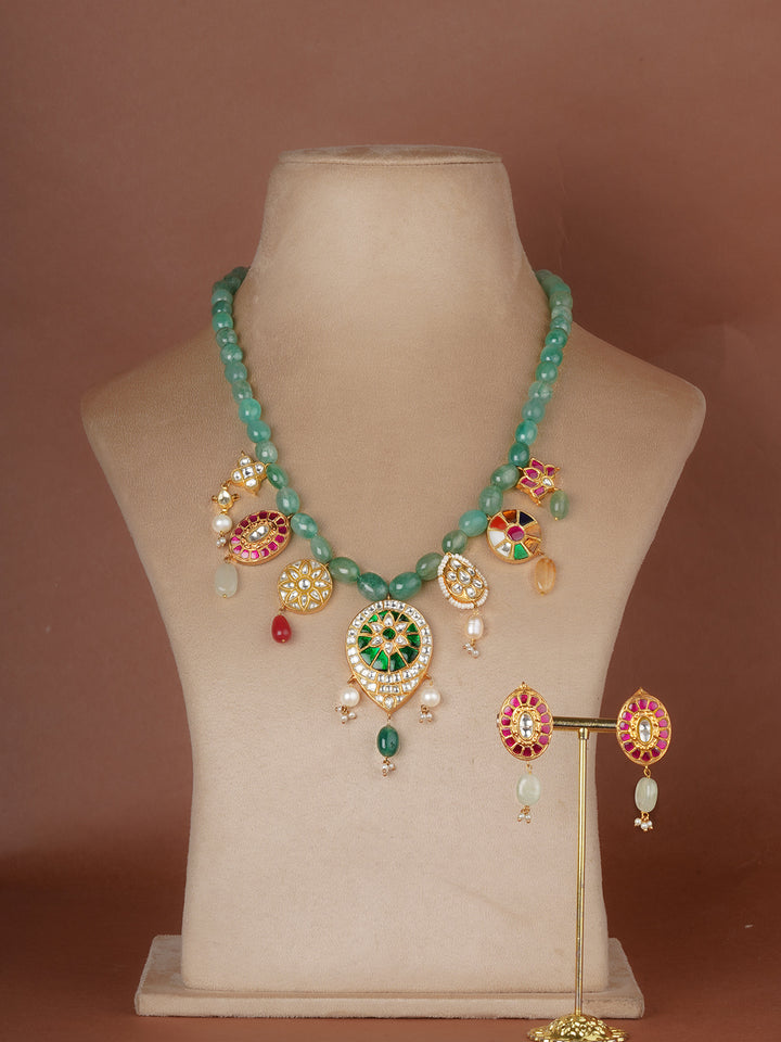 Navratna Gold Plated Thappa Jadau Kundan Necklace Set - TJ-S197N