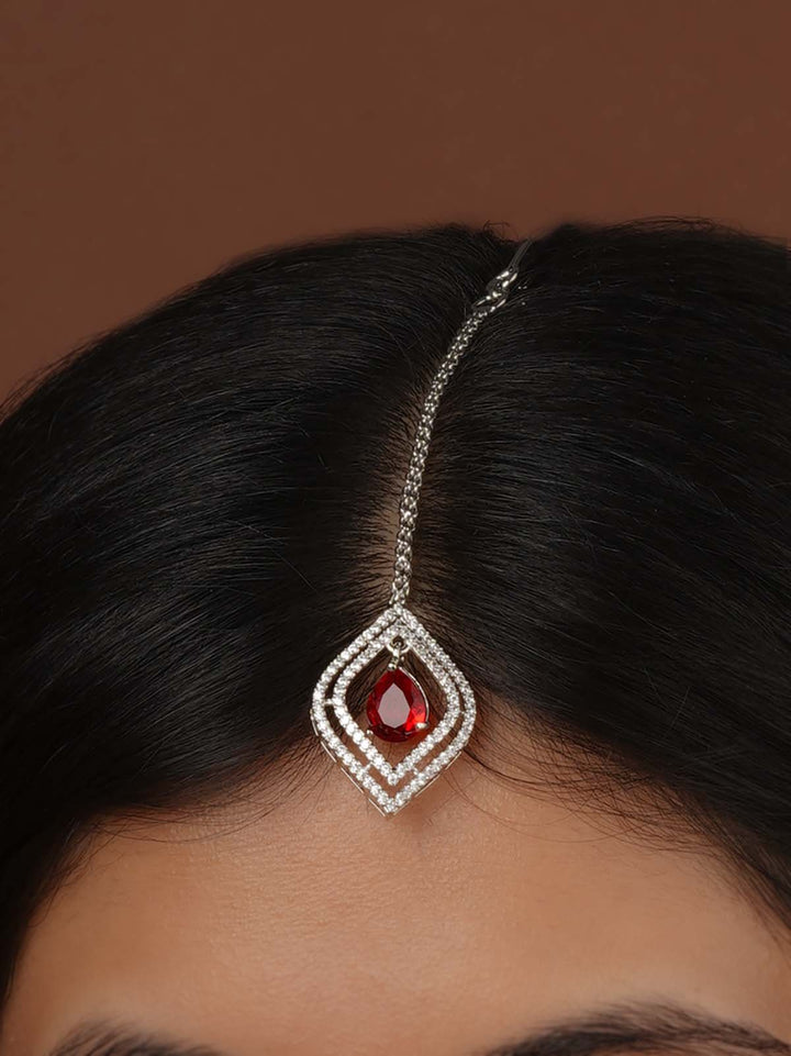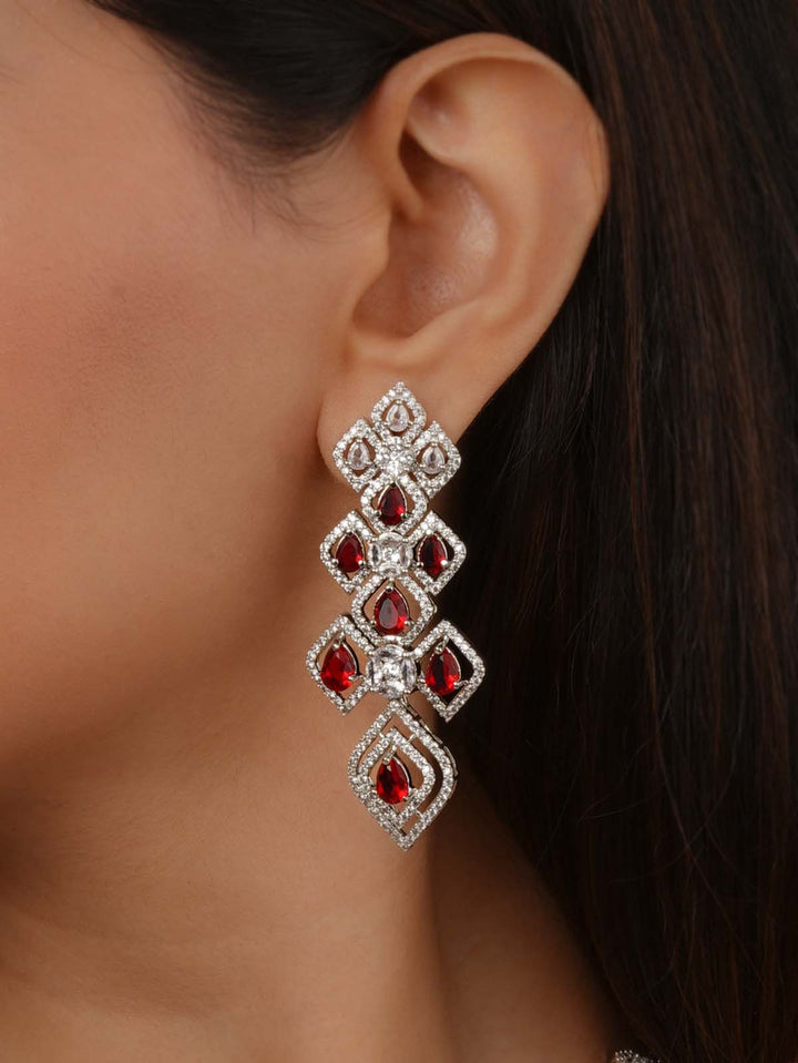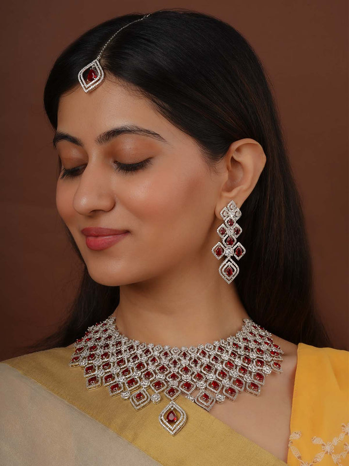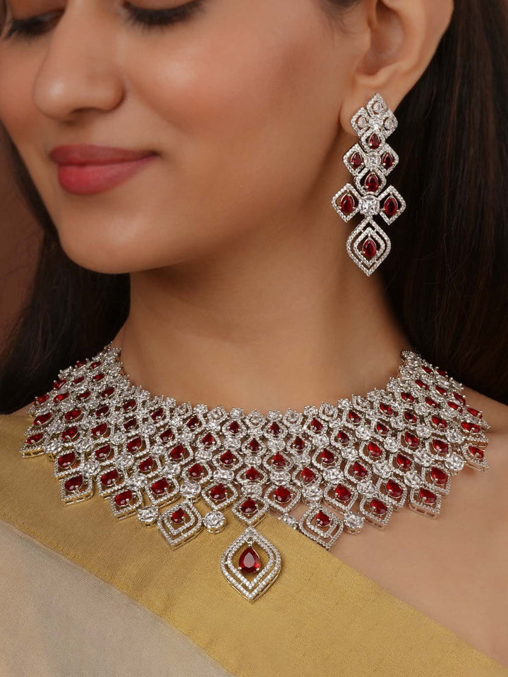 Red Color Silver Plated Faux Diamond Bridal Necklace Set - CZSET323R