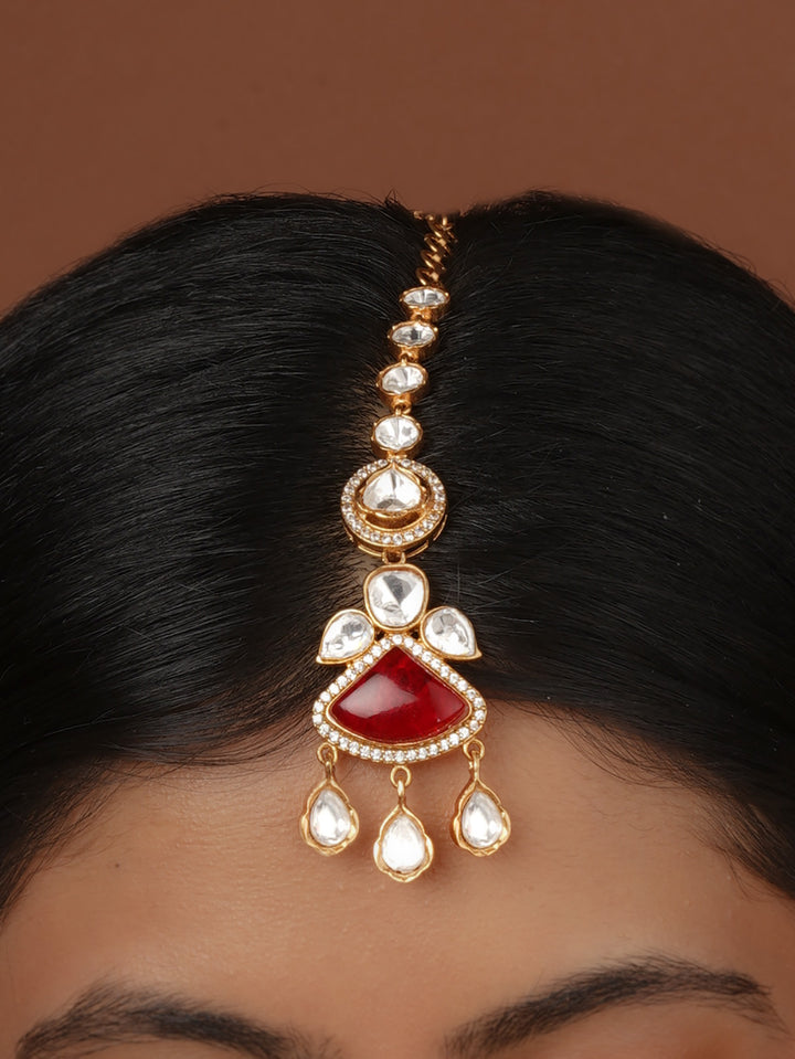 Maroon Color Gold Plated Faux Polki Maangteeka - PK-T54P