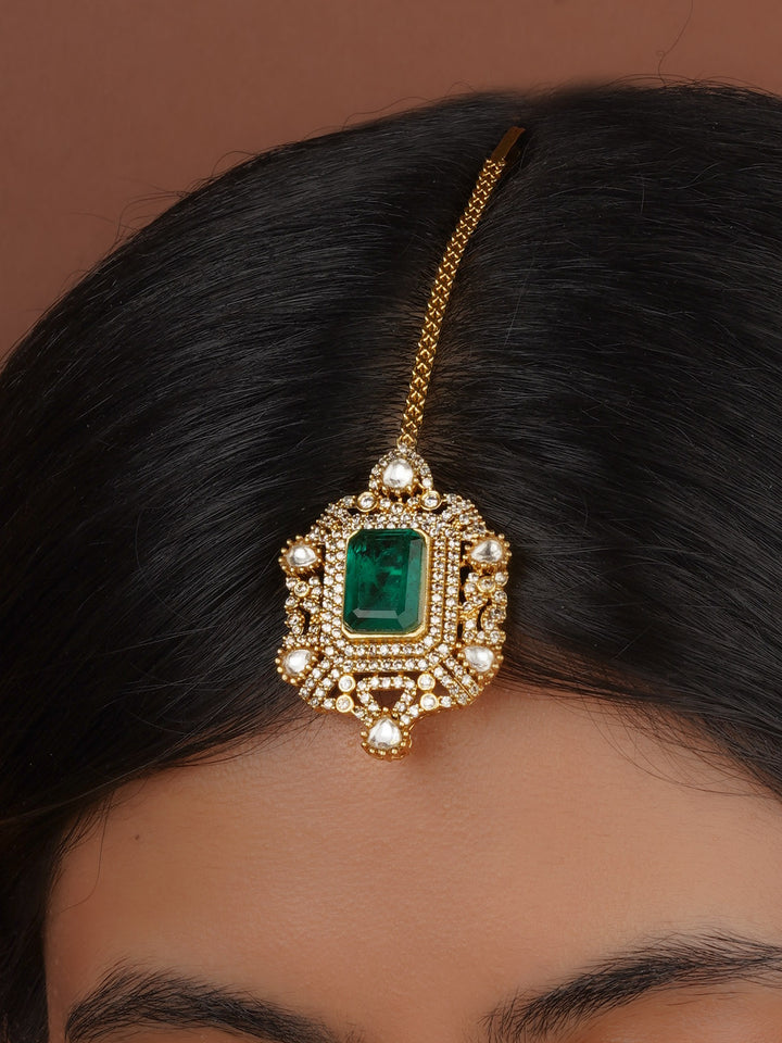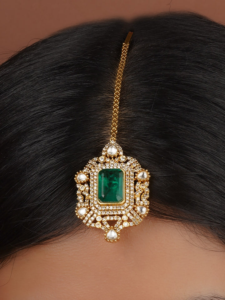 Green Color Gold Plated Faux Diamond Maangteeka - CZT49GR