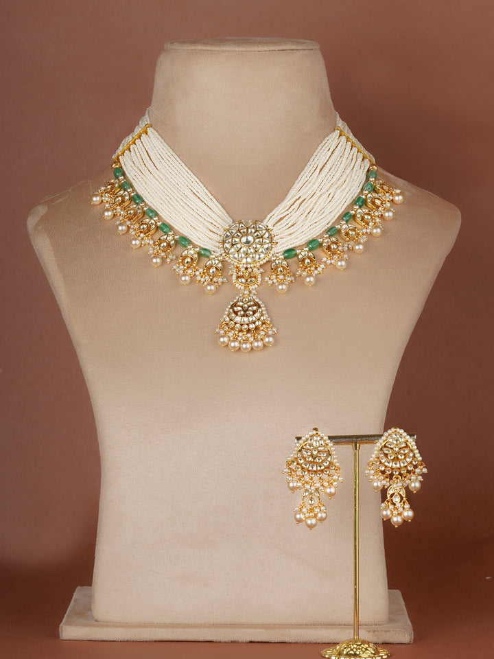 Green Color Gold Plated Jadau Kundan Necklace Set - MS2712Y
