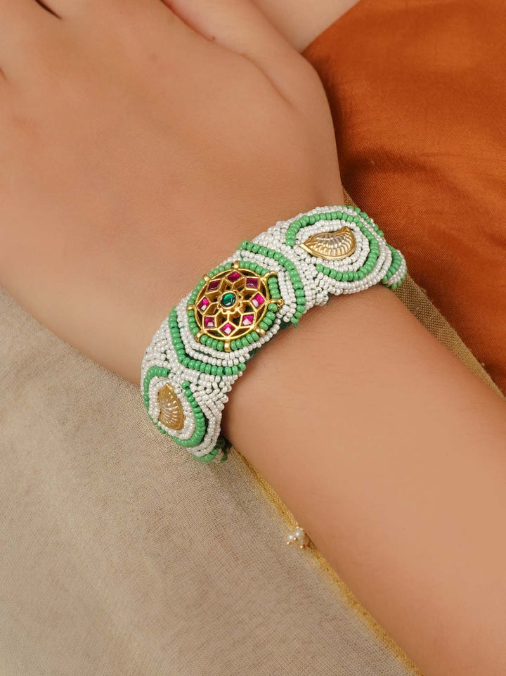 Mishr, by Mortantra is a collection of handcrafted Indian jewellery made with motifs of several kinds, having many different forms, features and emotions. Made with hand fully picked motifs, new and old, semi-precious beads and stones, our Mishra jewellery is an amalgamation of heritage and heirloom jewellery traditions and the rich craftsmanship of India. The jewellery is 22kt gold plated and finished in cultured pearls and takes pride in being skillfully crafted by the few of the finest jewellery artisans of our country.