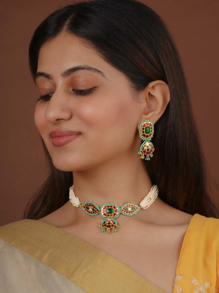 Mishr, by Mortantra is a collection of handcrafted Indian jewellery made with motifs of several kinds, having many different forms, features and emotions. Made with hand fully picked motifs, new and old, semi-precious beads and stones, our Mishra jewellery is an amalgamation of heritage and heirloom jewellery traditions and the rich craftsmanship of India. The jewellery is 22kt gold plated and finished in cultured pearls and takes pride in being skillfully crafted by the few of the finest jewellery artisans of our country.