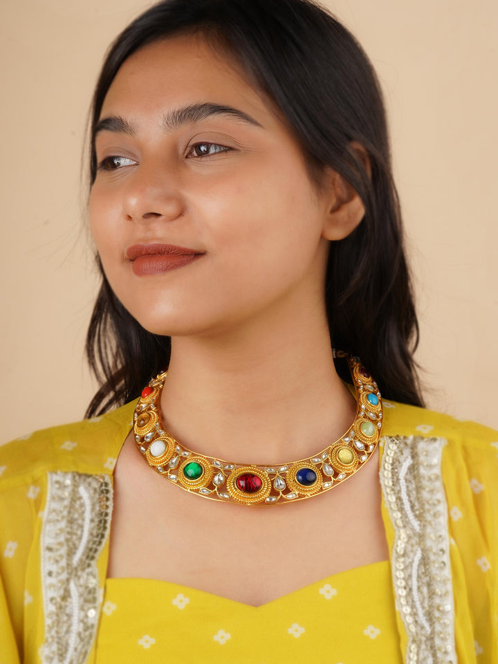Navratna Gold Plated Jadau Kundan Necklace - MN644N