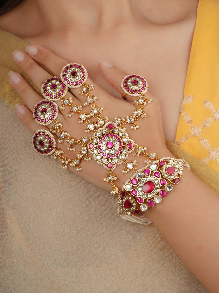 Pink Color Gold Plated Jadau Kundan Hathphool (1 Piece) - MHP258WP